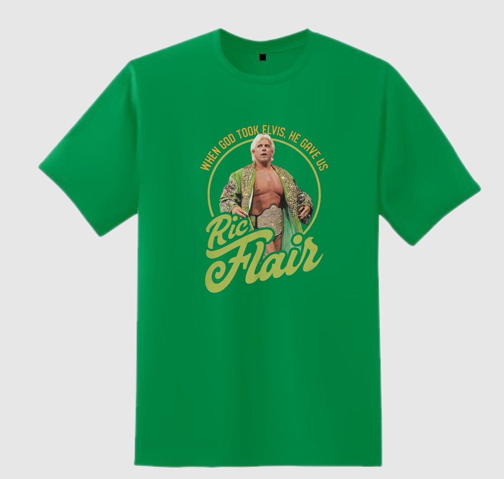 We use newest DTG Technology to print on to Elvis Ric Flair T-Shirt.