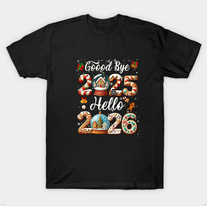 We use newest DTG Technology to print on to Good Bye 2025 Hello 2026 Christmas T Shirt.