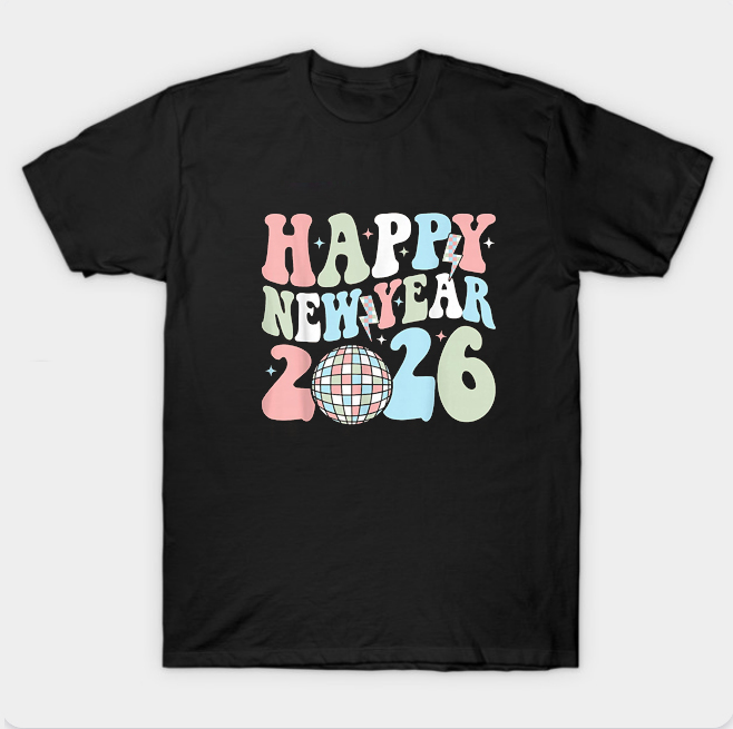 We use newest DTG Technology to print on to Groovy Happy New Year 2026 T-Shirt.