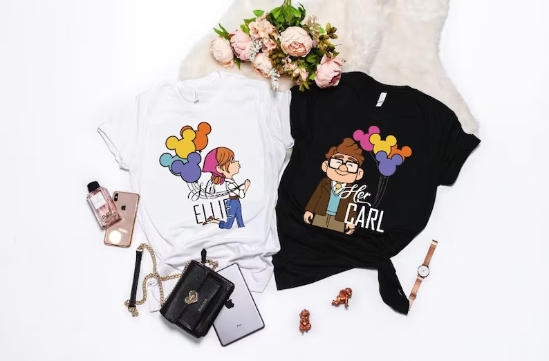 We use newest DTG Technology to print on to His Carl Her Ellie Shirts Couple T-Shirt.