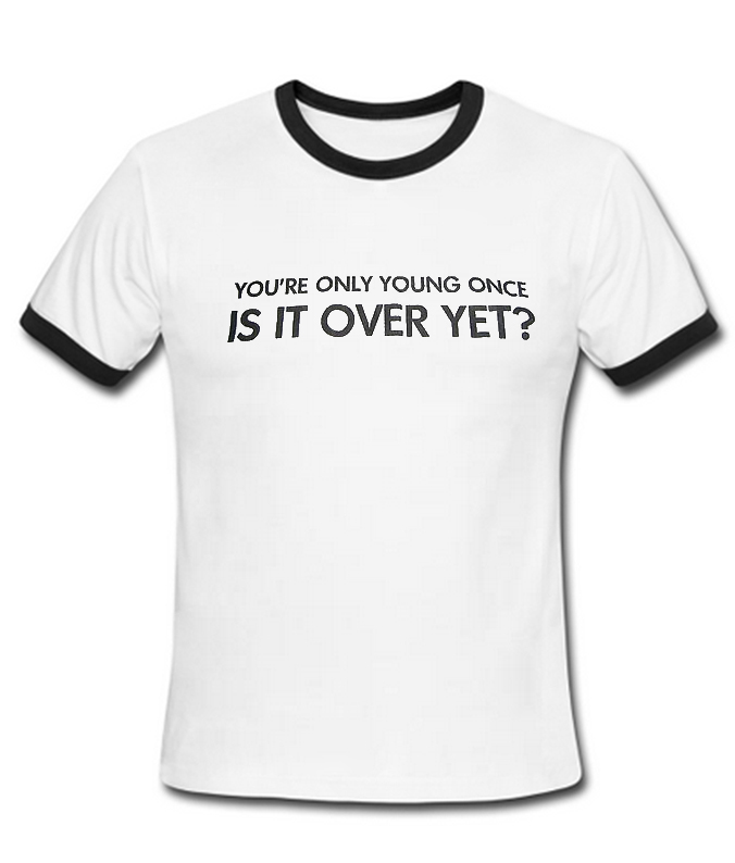We use newest DTG Technology to print on to IS IT OVER YET? Ringer T-Shirt.
